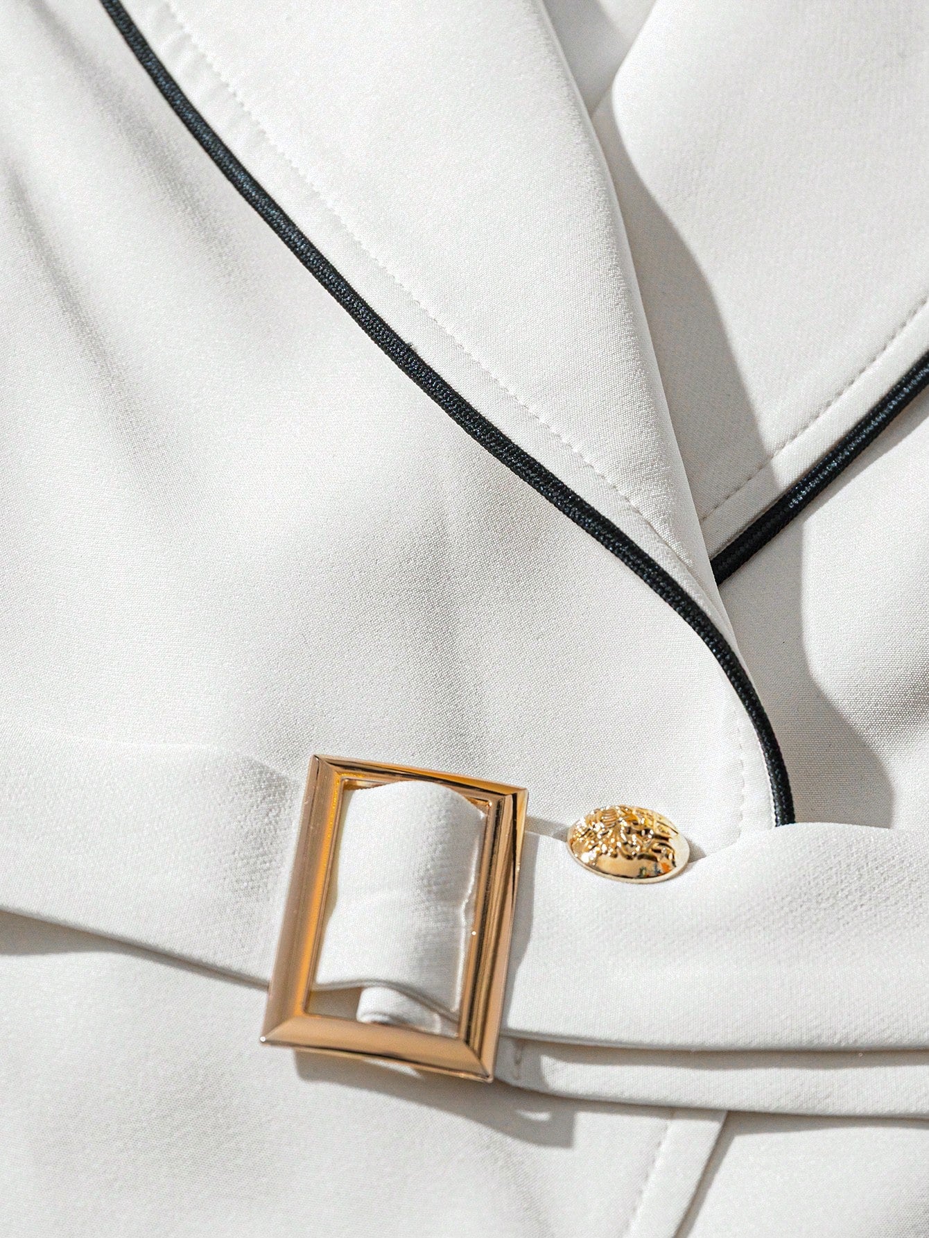 Master the art of modern power dressing with the ChiClick  Contrast Trim Belted Sleeveless Blazer, a masterclass in sharp, contemporary tailoring. This piece is defined by its bold contrast trim, which traces the clean lines of the notched lapels and pockets, creating a sharp, graphic statement.