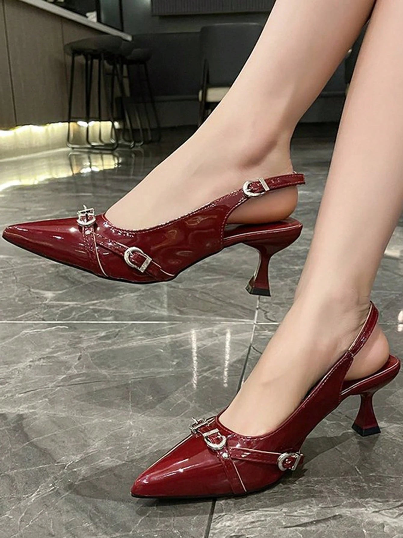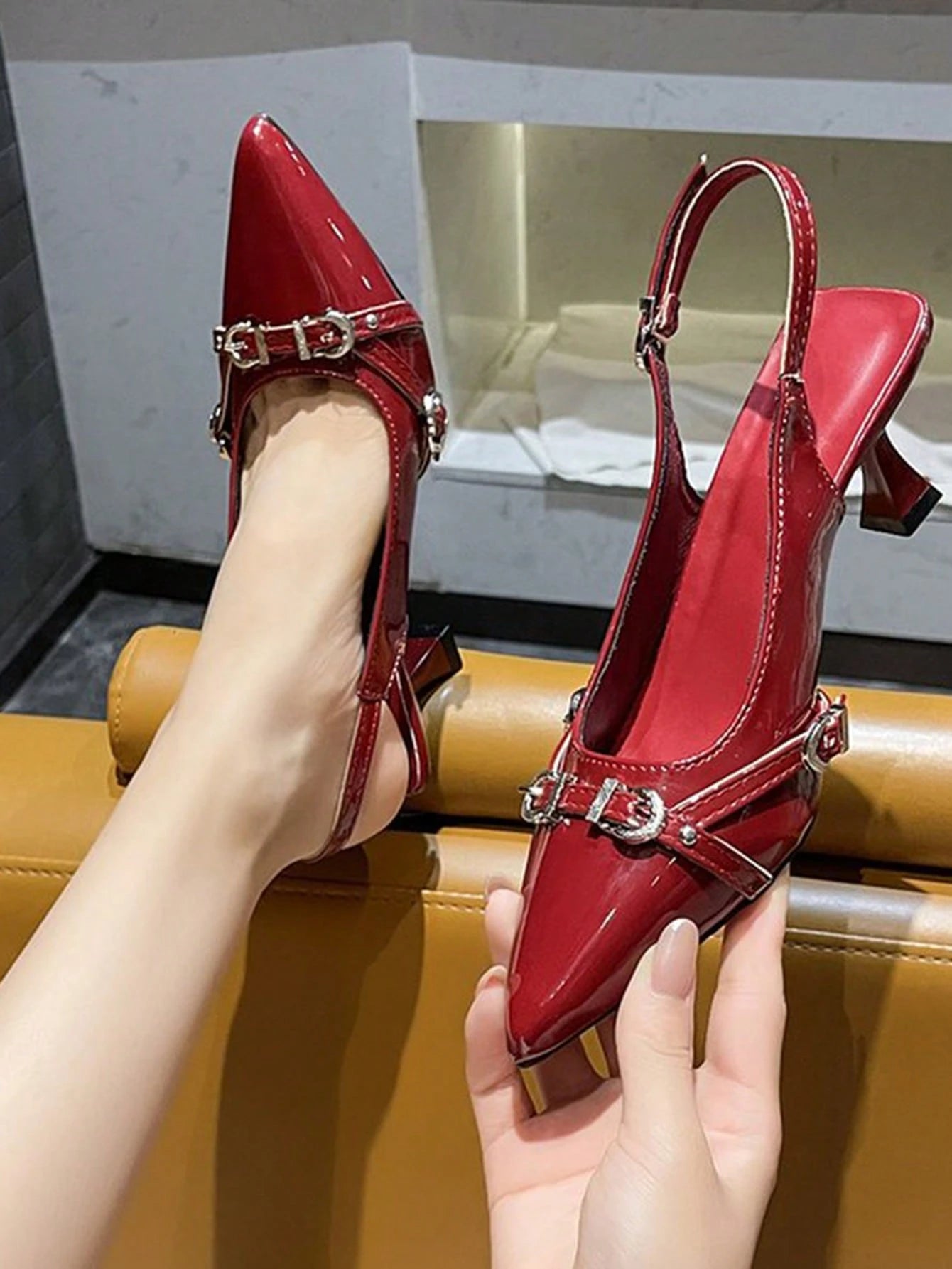 Unleash a new standard of edgy sophistication with the ChiClick Buckle Detail Pointed Toe Slingback Pumps. Meticulously crafted from a high-shine patent leather in a commanding shade of red, this pair is designed for the woman who walks her own path. The silhouette marries classic elegance—a sharp pointed toe and a delicate slingback strap—with a daring, rebellious spirit.