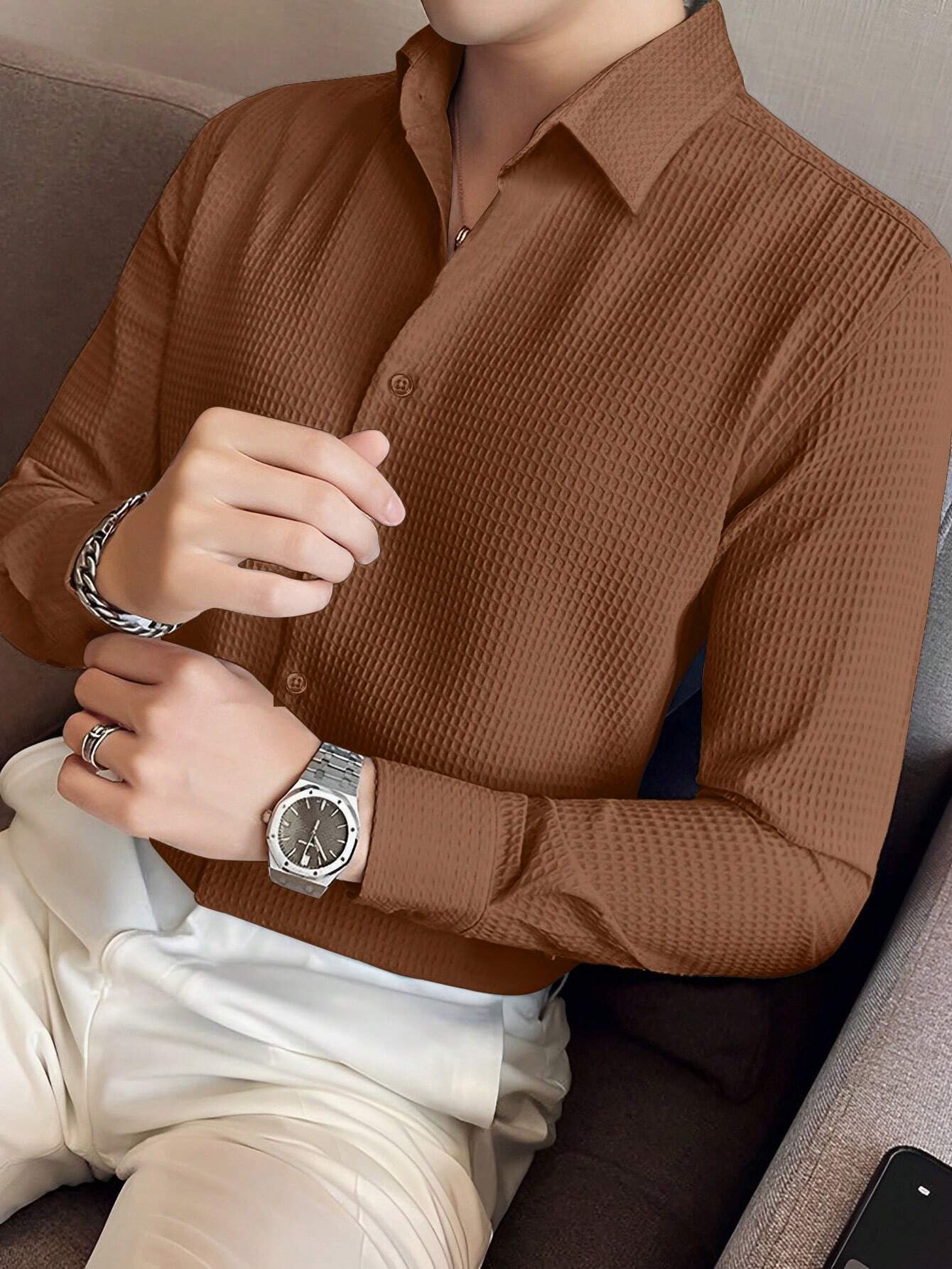 Redefine your smart-casual wardrobe with the ChiClick Textured Slim Fit Shirt, a masterpiece of modern refinement. Meticulously crafted from a unique, micro-textured fabric, this shirt presents a subtle, architectural weave that creates a stunning three-dimensional effect, catching the light with sophisticated depth.